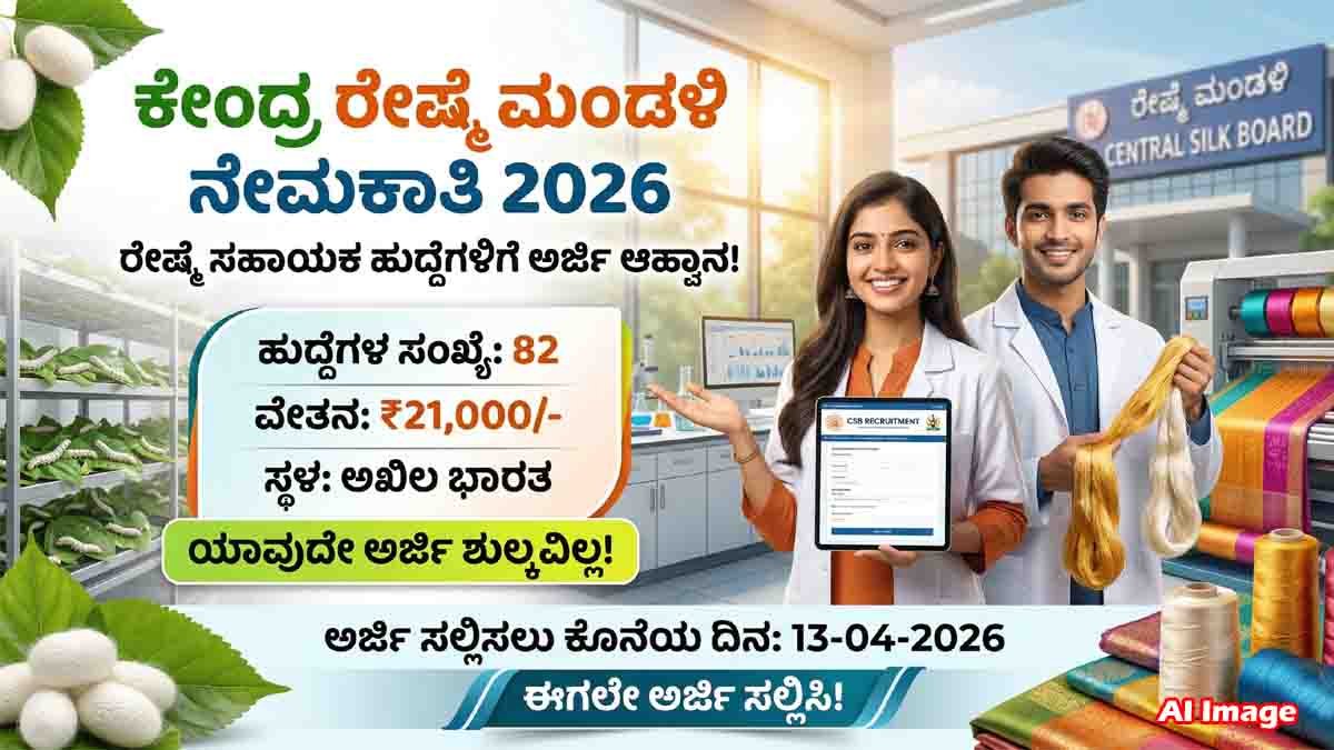 ಕೇಂದ್ರ ರೇಷ್ಮೆ ಮಂಡಳಿ (Central Silk Board – CSB) 2026ರಲ್ಲಿ 82 ರೇಷ್ಮೆ ಸಹಾಯಕ (Sericulture Assistant) ಹುದ್ದೆಗಳನ್ನು ಭರ್ತಿ ಮಾಡಲು (Apply Now) ಅಧಿಸೂಚನೆ ಹೊರಡಿಸಿದೆ. ಇದು ಕಾಂಟ್ರಾಕ್ಟ್ ಆಧಾರದ ಮೇಲಿನ ನೇಮಕಾತಿ ಆಗಿದ್ದು, ಅಖಿಲ ಭಾರತದ ವಿವಿಧ ಕೇಂದ್ರಗಳಲ್ಲಿ ಕೆಲಸ ಮಾಡುವ ಅವಕಾಶವಿದೆ. ಇನ್ನೊಂದು ವಿಶೇಷತೆ ಏನೆಂದರೆ – ಅರ್ಜಿ ಶುಲ್ಕ ಯಾವುದೂ ಇಲ್ಲ! ಹೌದು, ಯಾವುದೇ ಫೀಸ್ ಇಲ್ಲದೆ ನೀವು ಅರ್ಜಿ ಸಲ್ಲಿಸಬಹುದು. ಆಸಕ್ತ ಅಭ್ಯರ್ಥಿಗಳಿಗೆ ಇದು ಸುವರ್ಣ ಅವಕಾಶವಾಗಿದೆ.