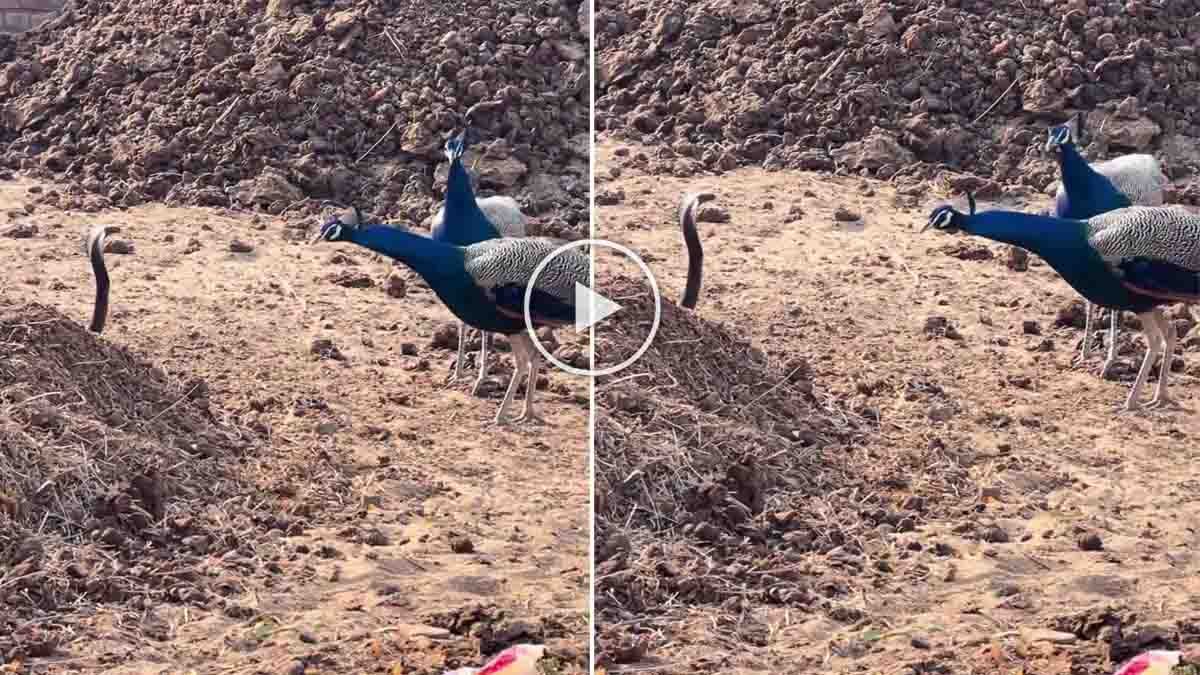 ಸಾಮಾನ್ಯವಾಗಿ ಹಾವನ್ನು ಕಂಡರೆ ಎಂತಹವರೂ ಒಂದು ಹೆಜ್ಜೆ ಹಿಂದೆ ಇಡುತ್ತಾರೆ. ಆದರೆ ಈ ವೈರಲ್ ವಿಡಿಯೋದಲ್ಲಿ ಎರಡು ಗಂಡು ನವಿಲುಗಳು ಮತ್ತು ಒಂದು ಹೆಣ್ಣು ನವಿಲು ರಾಜಗಾಂಭೀರ್ಯದಿಂದ ನಡೆದು ಹೋಗುತ್ತಿರುತ್ತವೆ. ಅಷ್ಟರಲ್ಲಿ ಇದ್ದಕ್ಕಿದ್ದಂತೆ ಎದುರಿಗೆ ಒಂದು ಭೀಕರ ನಾಗರಹಾವು (Cobra) ಪ್ರತ್ಯಕ್ಷವಾಗುತ್ತದೆ!
