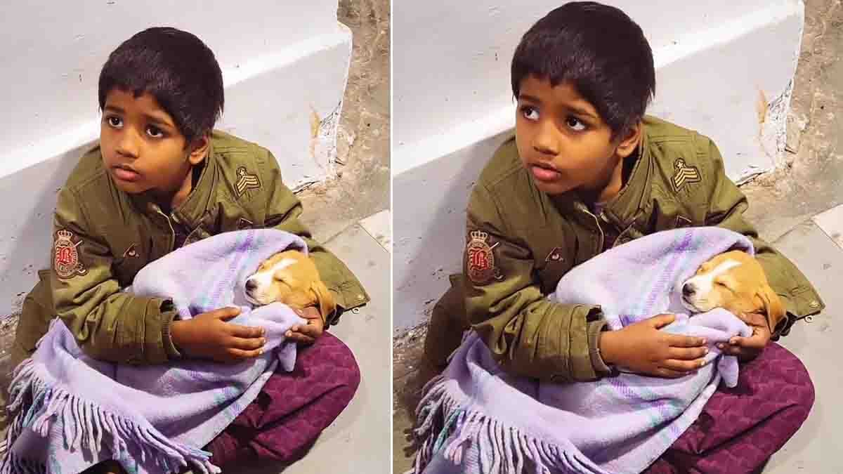 ಸಾಮಾನ್ಯವಾಗಿ ಮಕ್ಕಳಿಗೆ ಪ್ರಾಣಿಗಳೆಂದರೆ ಅಚ್ಚುಮೆಚ್ಚು. ಮನೆಯಲ್ಲಿ ಸಾಕು ನಾಯಿಗಳಿದ್ದರೆ ಅವುಗಳ ಜೊತೆ ಆಟವಾಡುತ್ತಾ ಸಮಯ ಕಳೆಯುವುದನ್ನು ನಾವು ನೋಡಿರುತ್ತೇವೆ. ಆದರೆ ಇಲ್ಲಿನ ದೃಶ್ಯ ಸ್ವಲ್ಪ ಭಿನ್ನವಾಗಿದೆ. ಬೀದಿ ಬದಿಯಲ್ಲಿ ಕುಳಿತಿರುವ ಈ ಪುಟ್ಟ ಬಾಲಕ, ತನಗಿಂತ ಚಿಕ್ಕದಾದ ಒಂದು ಮುದ್ದಾದ ನಾಯಿಮರಿಯನ್ನು ತನ್ನ ಮಡಿಲಲ್ಲಿ ಮಗುವಿನಂತೆ ಮಲಗಿಸಿಕೊಂಡಿದ್ದಾನೆ.