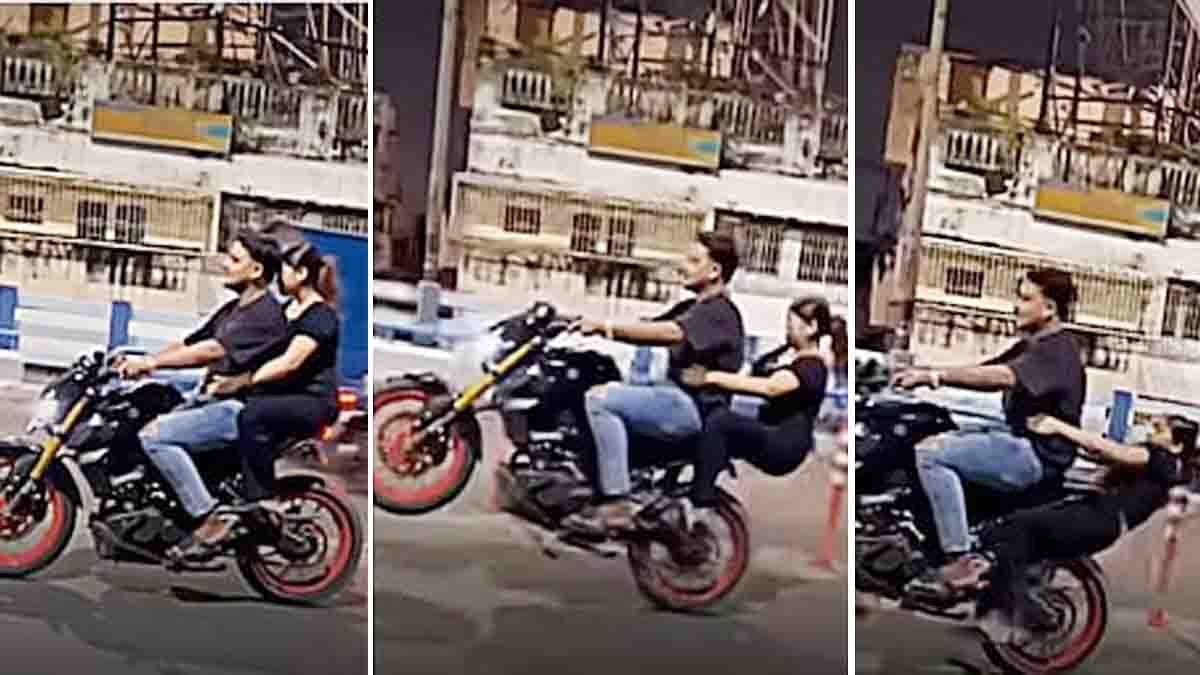 Mumbai bike stunt gone wrong leaves woman seriously injured during dangerous wheelie attempt