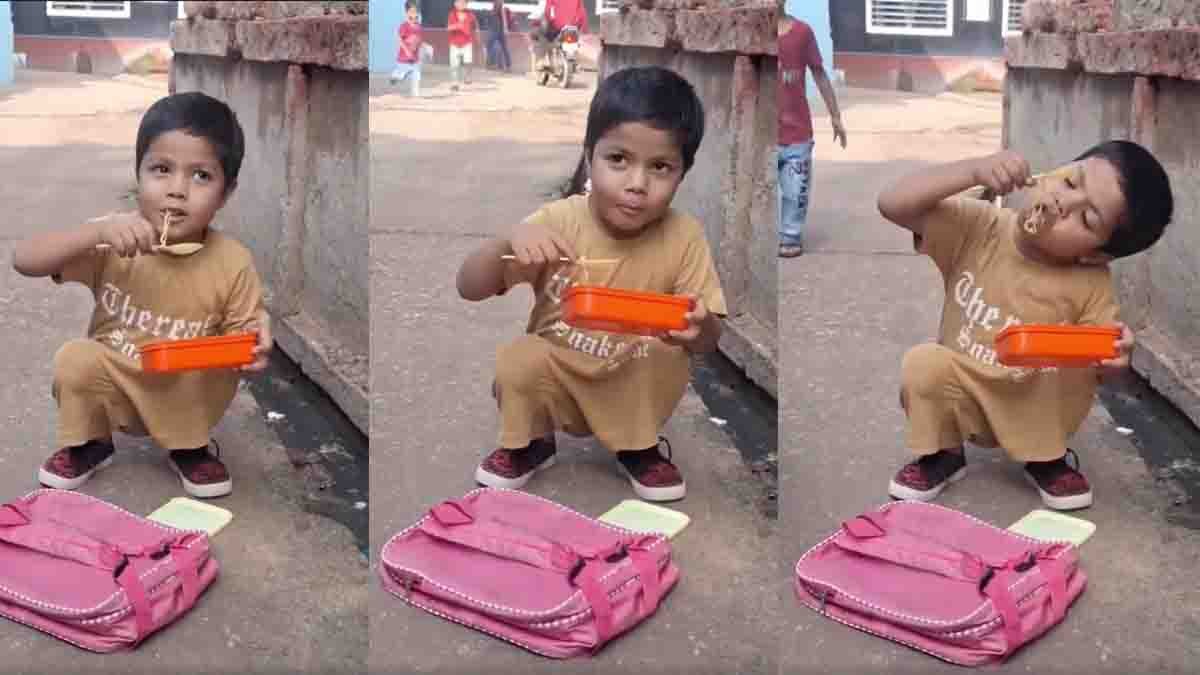 ಹೀಗಾಗಿ, ಅವನು ರಸ್ತೆಯ ಬದಿಯಲ್ಲಿರುವ ಚರಂಡಿಯ ಬಳಿ ಕುಳಿತು ತನ್ನ ಬ್ಯಾಗ್ನಿಂದ ಟಿಫಿನ್ ಬಾಕ್ಸ್ನ್ನು ಹೊರತೆಗೆದು ನೂಡಲ್ಸ್ ತಿನ್ನಲು ಆರಂಭಿಸುತ್ತಾನೆ. ಅವನ ಈ ಮುಗ್ಧ ಕೃತ್ಯವನ್ನು ಯಾರೋ ಮೊಬೈಲ್ನಲ್ಲಿ ವಿಡಿಯೋ ಮಾಡಿಕೊಂಡಿದ್ದಾರೆ. ವಿಡಿಯೋದಲ್ಲಿ, ಆ ಪುಟಾಣಿ ತನ್ನ ಪಾಡಿಗೆ ತಾನು ಊಟ ಮಾಡುವುದರಲ್ಲಿ ಮಗ್ನನಾಗಿದ್ದು, ಸುತ್ತಮುತ್ತಲಿನವರ ಮಾತನ್ನು ಲೆಕ್ಕಿಸುವುದಿಲ್ಲ.
