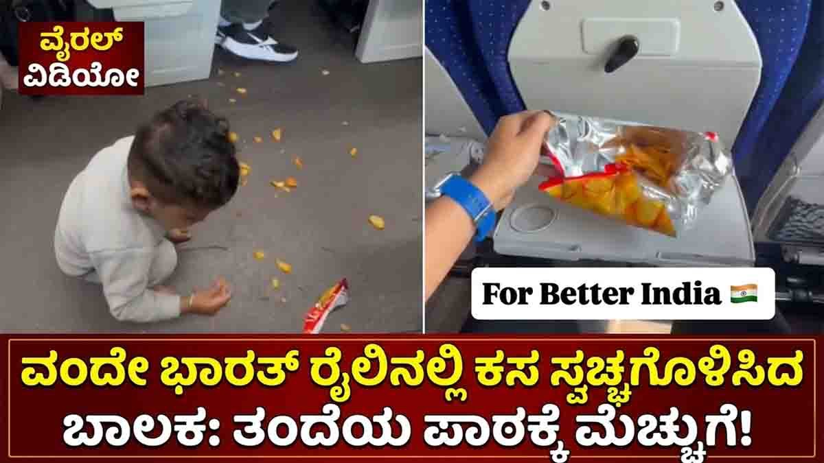 ವೇಗವಾಗಿ ಚಲಿಸುವ ವಂದೇ ಭಾರತ್ ಎಕ್ಸ್ಪ್ರೆಸ್ ರೈಲಿನಲ್ಲಿ ಸಮಲ್ ಎಂಬ ಎರಡು ವರ್ಷದ ಪುಟ್ಟ ಬಾಲಕ ತನ್ನ ತಂದೆಯೊಂದಿಗೆ ಪ್ರಯಾಣಿಸುತ್ತಿದ್ದ. ಪ್ರಯಾಣದ ಖುಷಿಯಲ್ಲಿದ್ದ ಆ ಮಗು ಆಟವಾಡುತ್ತಾ ತಾನು ತಿನ್ನುತ್ತಿದ್ದ ಚಿಪ್ಸ್ ತುಣುಕುಗಳನ್ನು ರೈಲಿನ ಸ್ವಚ್ಛವಾದ ನೆಲದ ಮೇಲೆ ಚೆಲ್ಲಿದ. ಸಾಮಾನ್ಯವಾಗಿ ಇಂತಹ ಸಂದರ್ಭ ಎದುರಾದಾಗ ಹೆಚ್ಚಿನ ಪೋಷಕರು ಮಗುವನ್ನು ಜೋರಾಗಿ ಬೈಯುತ್ತಾರೆ ಅಥವಾ “ಮಗು ಅಲ್ವಾ ಬಿಡು” ಎಂದು ತಾವೇ ಅದನ್ನು ಸ್ವಚ್ಛಗೊಳಿಸುತ್ತಾರೆ. ಇಲ್ಲವೇ ರೈಲ್ವೆ ಸಿಬ್ಬಂದಿ ಬಂದು ಕ್ಲೀನ್ ಮಾಡಲಿ ಎಂದು ಸುಮ್ಮನಿದ್ದುಬಿಡುತ್ತಾರೆ. ಆದರೆ ಈ ತಂದೆ ಮಾಡಿದ್ದು ಮಾತ್ರ ವಿಭಿನ್ನವಾಗಿತ್ತು. Read this also : ತಲೆ ಮೇಲೆ ಹುಲ್ಲಿನ ಹೊರೆ, ಅದರಲ್ಲೇ ಮಗನ ಸವಾರಿ! ಕಣ್ಣಾಲಿ ತುಂಬಿಸುವ ಹಳ್ಳಿ ತಾಯಿಯ ಮಮತೆ, ವಿಡಿಯೋ ವೈರಲ್…!